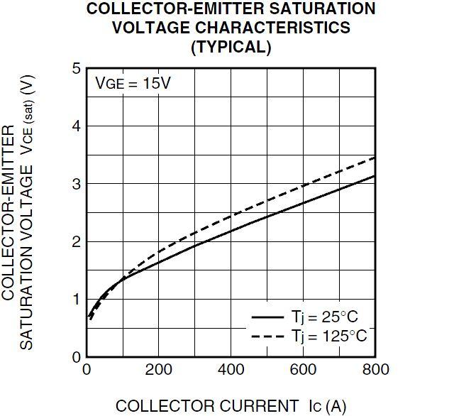 查到三菱CM400DY-34A和英飛凌FZ400R17KE3的晶體管特性與其完全相同,因此可以使用他們的“VCE-IC”特性曲線,獲得制動晶體管的導通壓降。