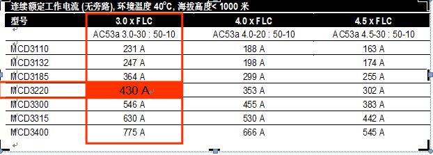 當(dāng)起動(dòng)電流倍數(shù)為3倍時(shí),額定電機(jī)滿載電流430A,由此推算其額定輸出電流能力為: