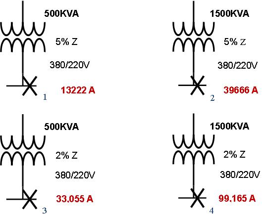 Z為電網(wǎng)(變壓器加上電纜)內(nèi)阻。圖二以電網(wǎng)內(nèi)阻為5%和2%為例,分別計(jì)算出Isca的值。