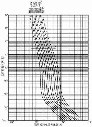 弧前時(shí)間具體值可從圖五查得??梢圆榈筋~定電流800A的快速熔斷器,當(dāng)短路電流為13222A時(shí),弧前時(shí)間<2mS;當(dāng)短路電流為99165A時(shí),弧前時(shí)間< 0.1mS。