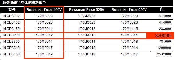 丹佛斯說(shuō)明書(shū)中要求MCD3220前級(jí)安裝BUSSMANN的170M6012半導(dǎo)體熔斷器,要求的可控硅需要的短路保護(hù)I
