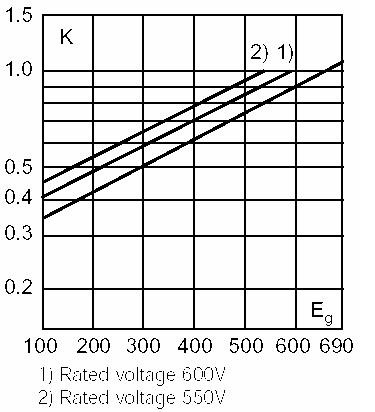2t值為660V電網(wǎng)電壓時(shí)的數(shù)據(jù),所以還要查表求出400V電網(wǎng)電壓時(shí)的修正系數(shù),從下圖可以查到修正系數(shù)約為0.61。