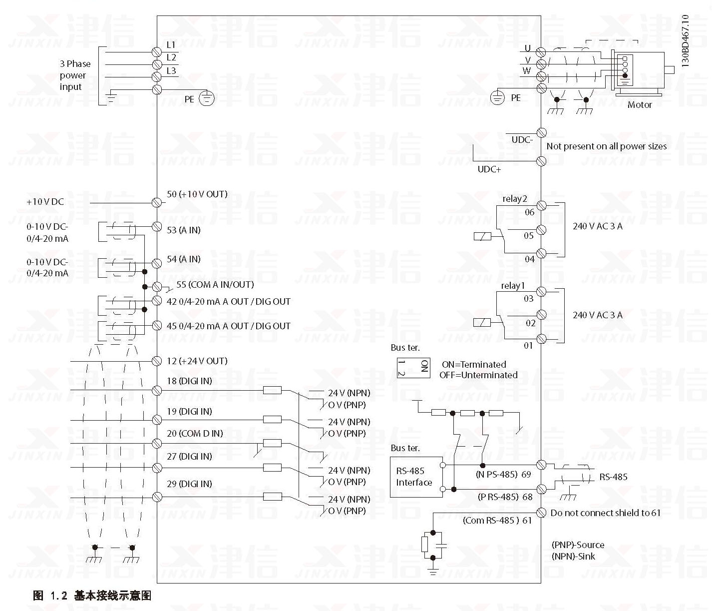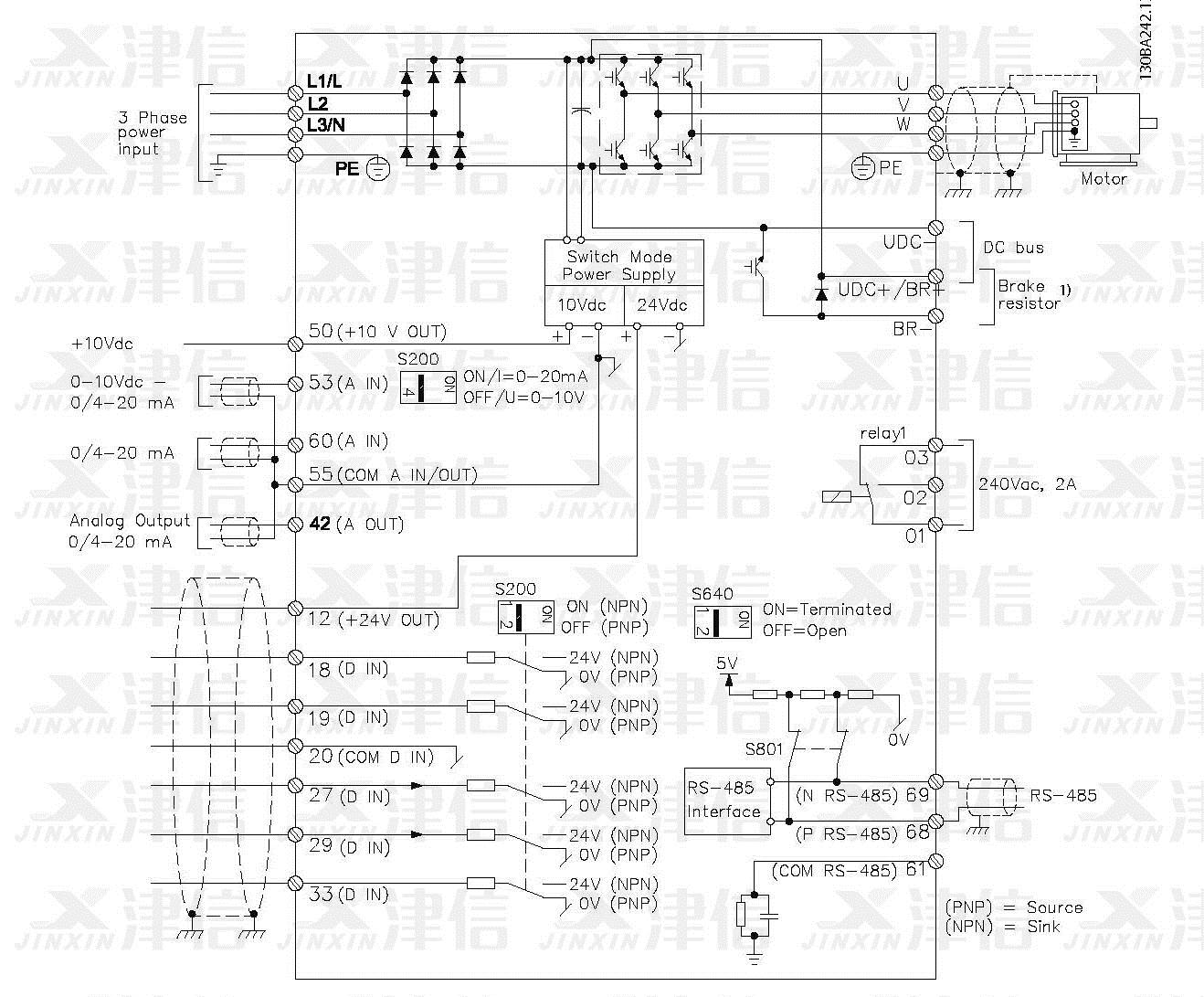 丹佛斯變頻器采用交-直-交工作原理,先將三相交流電經(jīng)整流部分變換成直流,經(jīng)濾波后通過(guò)IGBT或其它電力電子器件逆變成頻率和電壓均可變的三相交流電供電機(jī)使用。變頻器的基本構(gòu)成由主電路(包括整流器、中間直流環(huán)節(jié)、逆變器)和控制電路組成,以下是丹佛斯各系列變頻器的接線示意圖。