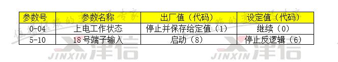3.  通過面板按下面的參數分別在0號菜單設置上電工作狀態,5號菜單設置18號端子輸入值。