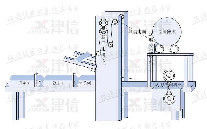 送膜控制有定長送膜和色標對標送膜兩種情況。定長送膜,只需根據(jù)主軸編碼器信號,主軸轉(zhuǎn)一圈(輸送一個物料),送膜部分輸送一段固定長度的膜即可,不需動態(tài)調(diào)整;色標對標送膜,不但要求主軸轉(zhuǎn)一圈輸送一段固定長度的膜,還要求膜上的色標點正好落在主軸的設(shè)定相位點上,以使橫切刀能精確地切在色標點上。因此色標對標送膜還需要根據(jù)檢測到的實際色標相位差,在生產(chǎn)過程中動態(tài)調(diào)整送膜電機的相位。