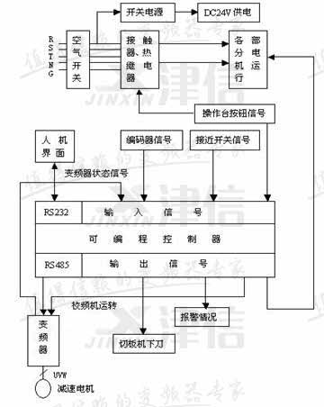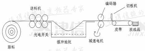 按上述工藝數據要求對這類控制系統進行設計并不困難,但由于傳統解決方案存在的缺陷,往往留下諸多遺憾。如對低端設備而言,傳統實現方法一般采用直流調速系統,實施方案的缺點是:系統笨重、耗電量大、調試復雜、維護成本高;在定位控制方式方面,一般采用讀取行程開關信號后通過預減速配合氣壓制動的定位方式, 剪切效率很低, 誤差較大。而對高端設備,一般采用直流伺服技術,雖然精度和效率得以保證,但價格非常昂貴,產品性能價格比難以令人滿意。