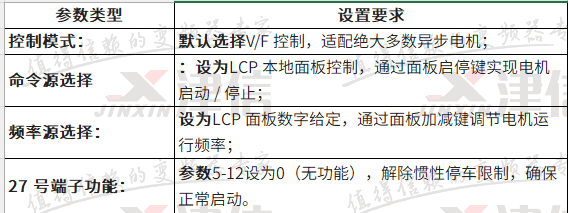 3、觀察 LCP 面板顯示的運行電流、輸出頻率、電壓,同時檢查電機溫升、負載設備運行狀態(無卡滯、無異響、無抖動);