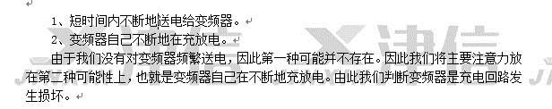 更換變頻器充電卡,依次安裝好變頻器的電源卡,控制卡,操作面板及上蓋板等。檢查變頻器的二極管特性及對地絕緣,符合送電的標準。將變頻器送電,自檢通過后,測量輸入側電源電壓,輸入變頻器參數,開機輸出電壓平衡。帶負載測量輸入和輸出電流平衡,變頻器修復。
