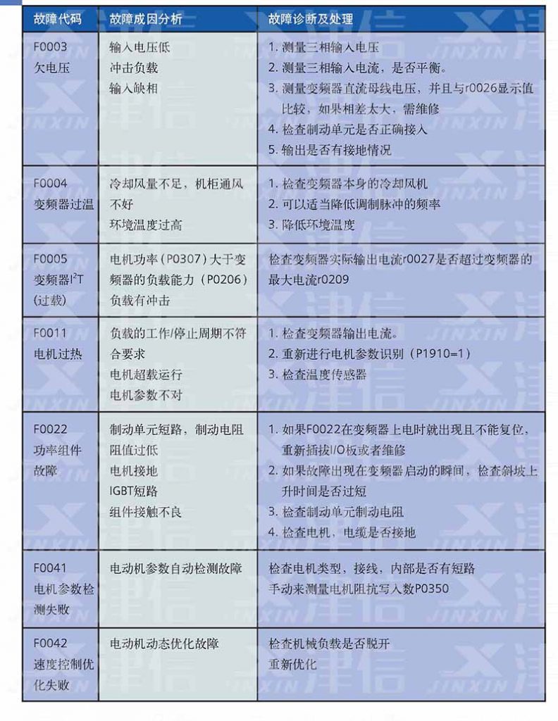 二、F0003欠電壓,F0004變頻器過溫,F0005變頻器過載,F0011電機過熱,F0022功率組件故障,F0041,F0042