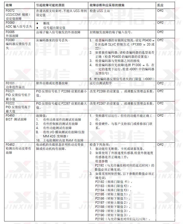 故障信息以故障碼序號(hào)的形式存放在參數(shù)R0947 中(例如,F(xiàn)0003=3)。相關(guān)的故障值可以在參數(shù)R0949 中查到,如果該故障沒有相關(guān)的故障值,R0949 中將輸入0。而且,可以讀出故障發(fā)生的時(shí)間(R0948)和存放在參數(shù)R0947 中的故障信息序號(hào)(P0952)。