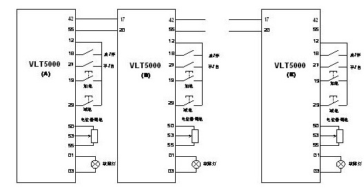 系統由5臺VLT5000系列變頻器及輔助的開關、指示燈、電位器及必要的空開等電氣器件組成。圖-1中A變頻器的速度作為主速給定(它自身的速度由外部電位器給定), A變頻器的42號端子對應自身輸出轉速,自動的轉化為脈沖信號(頻率)輸出給B變頻器,作為B變頻器的速度給定信號(通過B變頻器的29號端子來接收脈沖信號),然后再由B變頻器通過修改內部參數327號,經過計算后相應的輸出一定的轉速。同理B變頻器對應自身輸出轉速自動的轉化為脈沖信號(頻率)通過42號端子輸出脈沖信號(頻率)作為C變頻器的速度給定信號(通過C變頻器的29號端子來接收脈沖信號),以此類推,一直到E變頻器。在此過程中,所有速度給定信號都是數字式的(既速度信號通過給定的脈沖頻率的變化,結合自身內部的計算實現不同的轉速)。