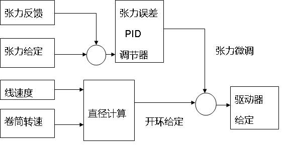 由于采用以上技術(shù)方案,使得排線(xiàn)平整,進(jìn)而使收線(xiàn)伺服的控制是典型的中心卷繞控制。中心卷繞控制原理框圖如圖3所示。根據(jù)收線(xiàn)伺服當(dāng)前實(shí)際轉(zhuǎn)速計(jì)算需要的開(kāi)環(huán)給定量,同時(shí)通過(guò)跳舞輪反饋引入張力調(diào)節(jié),最終確定收線(xiàn)伺服驅(qū)動(dòng)器的給定量。