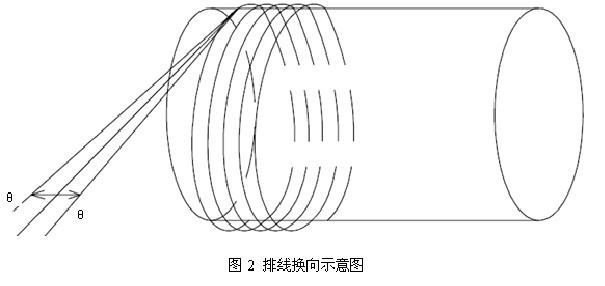 在解決方案中,著重改善收線(xiàn)排線(xiàn)和放線(xiàn)排線(xiàn)的方向切換,如圖2所示,在排線(xiàn)到收線(xiàn)盤(pán)邊緣時(shí),即換向時(shí)提高排線(xiàn)伺服速度,從該排線(xiàn)方向的排線(xiàn)成型角度跳轉(zhuǎn)到相反排線(xiàn)方向的排線(xiàn)成型角度,消除了低速換向?qū)е碌耐辜绗F(xiàn)象,使排線(xiàn)平整。