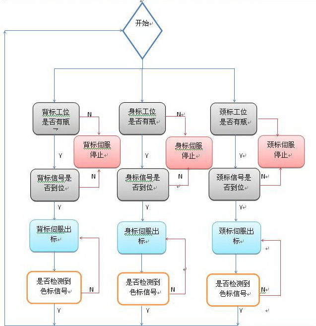 啤酒貼標機由進瓶傳送帶、主軸、出瓶傳送帶、貼標伺服及各個位置傳感器組成。當設備運行時,系統(tǒng)會檢測當前貼標工位是否有瓶子,如有,則對應得貼標伺服開始動作。例如當系統(tǒng)檢測到背標工位上有瓶子,且貼標有貼標信號時,則貼標伺服開始動作,由色標檢測傳感器來結束貼標動作,身標與頸標動作與背標一致。
