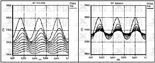 圖6中顯示的是加裝交流和直流電抗器對直流整流電壓的影響。從測量結(jié)果可以清晰看出加裝交流電抗器雖然對直流電壓上的高次諧波(520VDC以上)有明顯的抑制作用,但同時(shí)會(huì)造成直流側(cè)電壓的明顯損失。而直流電抗器在濾除高次諧波的同時(shí)對于直流電壓不會(huì)造成任何電壓損失