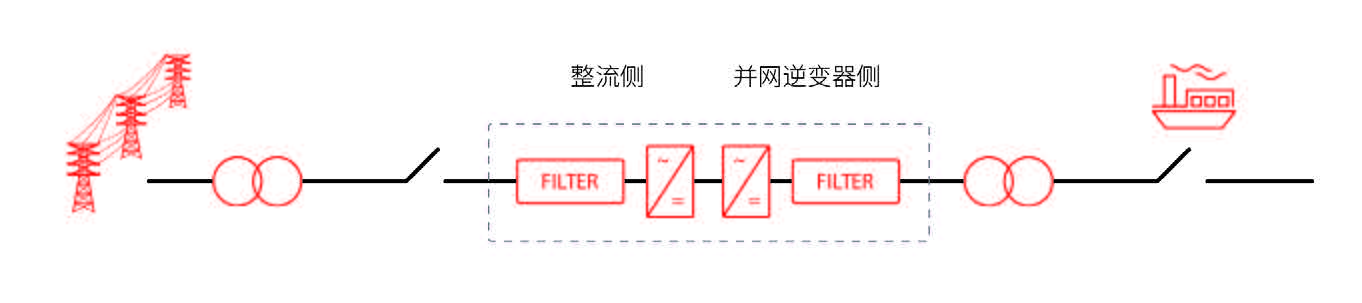 丹佛斯岸電電源系統通常包含岸側整流裝置和船側并網變流器裝置,如下圖所示: