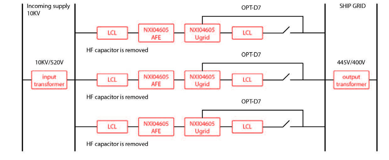此項目并網電源采用VACON®NX系列共直流母線傳動產品, 含3臺AFE整流裝置(310kW) 和3臺并網變流器(310kW)。